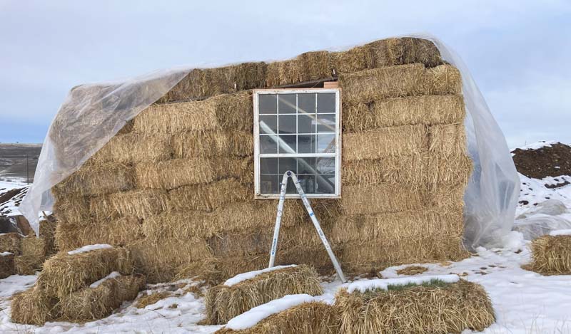 This time, though, the little pig decided to hedge his bets and overbuild. He put wooden supports in the 4 corners, along the bottom, and diagonally across the walls. He drove stakes into every other bale and alternated the direction of the bales at the corners.