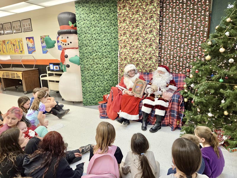 The evening of Tuesday, December 10 brought students and their families in for the school’s twice per year community literacy night. Santa and Mrs. Claus were on hand with their small pup to greet children, ask their requests, receive letters, and pass out candy canes. On top of that, Mrs. Claus read The Night Before Christmas and explained the origin of the story. Guests were welcomed to enjoy a dinner of homemade chili and cornbread provided by Angie Mettie, who coordinated the event, and the school’s PTO (Parent Teacher Organization). Sugar cookies were available to decorate as well as letter writing templates to put in Santa’s mailbox.