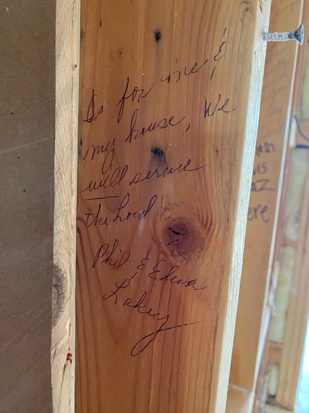 During demolition and construction they found scriptures written on wall studs from when the church was being built or possibly remodeled. They were able to save and preserve many of these and they are still in the building.
