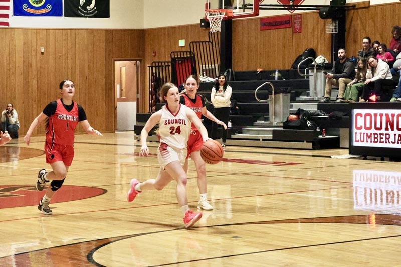 #24 Senior Eliza Bingham during Council’s game against Greenleaf on January 8. Council won 74-20 and next play at HSB on January 15. Photo credit: The Record Reporter