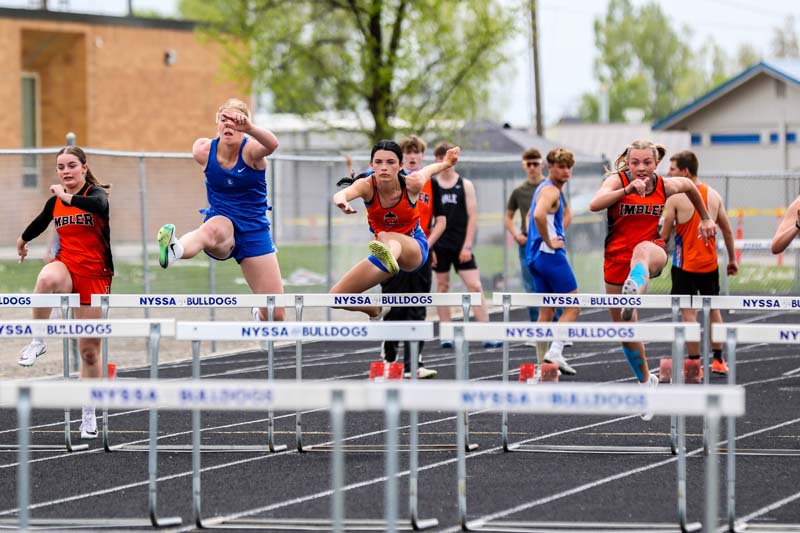 Lexi Gay clears a hurdle in the 100M hurdles on April 25th. Lexi took 1st place with a time of 16.86 seconds. Photo credit: Patty Guilford