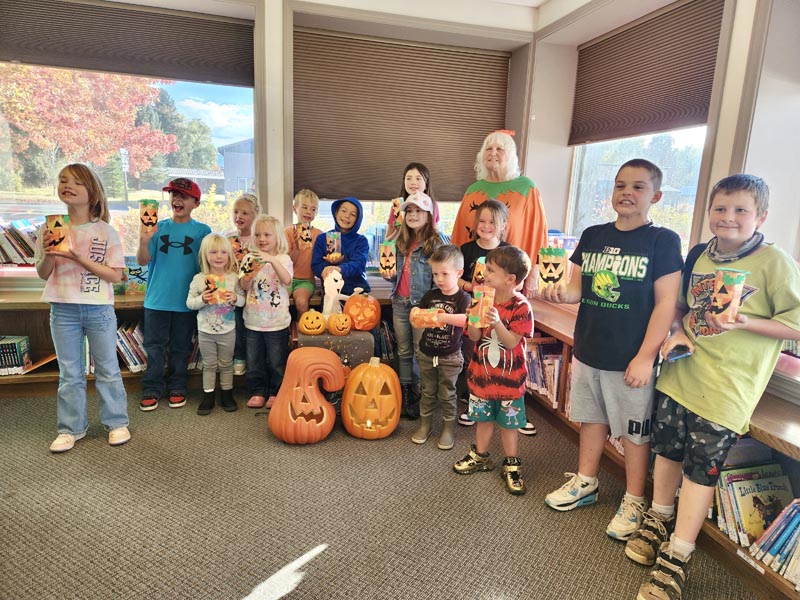 Jack-O-Lanterns filled the Meadows Valley Library for storytime on Wednesday, October 8. About 30 kids listened to Pick a Pumpkin by Patricia Toht and Little Boo by Stephen Wunderli, read by volunteer Marlene Clark. Children then created a lantern craft, complete with a small light, led by librarian Audrey Crogh. The next story time will have a Funny Face theme and will be held Wednesday, November 12 from 4:00 - 4:45 p.m..