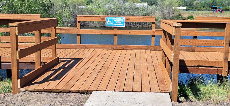 When Danna went to look at the pond, she noticed the deck was very much in need of repair, so she contacted Parks and Recreation, who manages the park. She went to a couple of their meetings and mentioned that the deck was in poor condition and could be a safety hazard, so they made it a priority project for this spring and just completed repairing and replacing the damaged boards and replacing the rails. They also made some lower sections of rails so that young children and the handicapped could more easily cast over the rail!