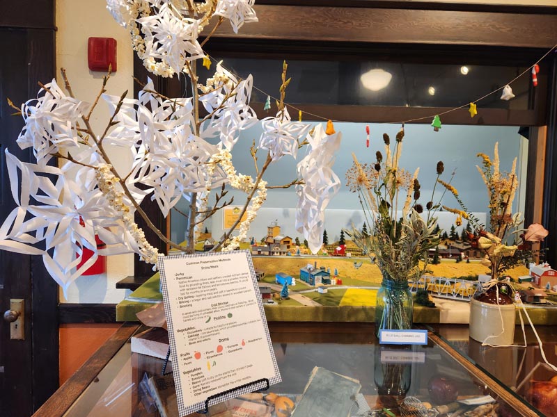 Menus may have included trout or salmon, venison, various poultry, or pork along with preserved foods and baked goods. Settlers could use foraged items like mushrooms and berries for the meals and plants, herbs, or flowers for gifts, decorations, medicine, or tea. Gifts were often hand made or cherished objects. The exhibit describes this saying, “A pair of knitted mittens, a cap, a wood carving, the pride of a young child’s gift of a hand scripted signature, written words or a song sung was sufficient when the world was what you made it long ago.”