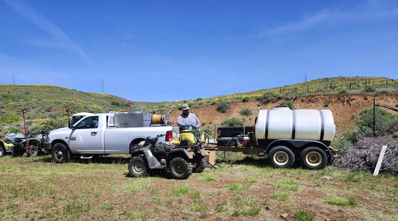 For this first spray day, the LWRCWMA (Lower Weiser River Cooperative Weed Management Area) set-up on the Roy and Linda Mink ranch. The Mink’s offer a corner of their ranch, with easy access to the highway, to be used by the county. Everybody shows up with their own sprayer set-up, which are typically 4-wheelers, side-by-sides, and tractors with spray tanks. There is also an occasional backpack sprayer. Bonnie Davis, County Weed Superintendent, Deb DeHaven, Professional Applicator, and Dakota Taylor, Professional Applicator, arrive on site pulling the CWMA trailer and a water tank. They calculate and measure herbicides, fill spray tanks, and do other jobs throughout the day to assist the sprayers. All projects have coordinators. Justin Mink was the coordinator for this spray day.