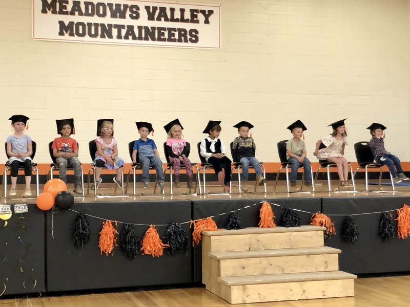 Meadows Valley School had two graduation ceremonies on May 29, 2024. First the Kindergarten class was presented at 2:30 in the afternoon. Miss Meg showed the audience how the youngsters check in every day. They not only check in physically, but mentally and emotionally too. They line up and give a big leap forward all together. Next, each child chose a character trait they learned about this year, such as responsibility or honesty and gave an example of how they model that trait. Each child also had a letter from the word Kindergarten and took a turn holding it up and reciting part of a poem. Miss Katie spoke about how proud she is of them and instructed them as they move on to the next grade to keep asking questions, spreading kindness and keep dreaming big. She also thanked them for being awesome and wished them a summer of fun. Two fathers were then brought up onstage. John Rhodes and (Braxton’s dad) were tied together to demonstrate some of the character traits learned during the year. They did very well being able to avoid a tug of war. Miss Meg then gathered the students around her and read the book, “What the Road Said”. Its message was to be kind and curious and even if you take the wrong path sometimes, it’s OK. Certificates of promotion were handed out as each student said what they want to be when they grow up. Emma Clark - Ballerina; Leo Coronel Lopez - Firefighter; Poppy McDaniel - Astronaut; Patrick Edwards - Firefighter; Rose Morris - Doctor; Elijah Rhodes - Soccer Player; Boomer Swenson - Cowboy; Braxton - Cowboy; Averie Wallace - Doctor; Asher Marshall - Builder. Flowers were then handed out to families by the little tykes and pictures were taken. The whole thing was just precious. Futures are bright for the Class of 2036!