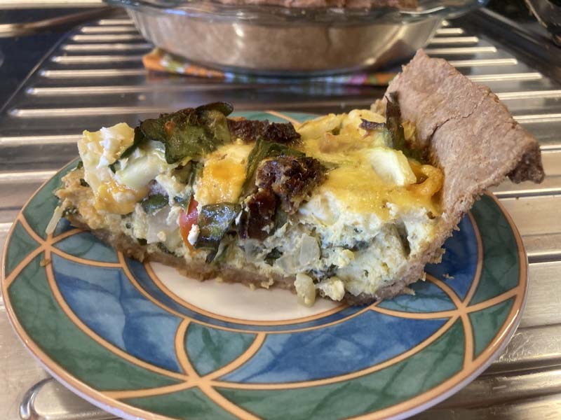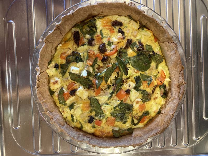 There are many ways to make a good quiche. I thought about doing a traditional quiche recipe when suddenly I was inspired to put a spin on things and do a Mediterranean quiche recipe. I enjoy the flavor of Kalamata olives and feta cheese together, so those were my base starters and with that I put the rest together. I used local farm fresh eggs which have a richer flavor and come from happy chickens. For the pie crust I used whole wheat which makes it a little bit more dense and not as flaky. I haven’t tried making pie crust with gluten free flour yet but it might be a fun experiment to try. Homemade pie crust isn’t easy to make and one can be bought pre-made at the grocery store. I personally like to make my own. The key to making light and flaky homemade pie crust is to keep it cold and touch it with your hands as little as possible.