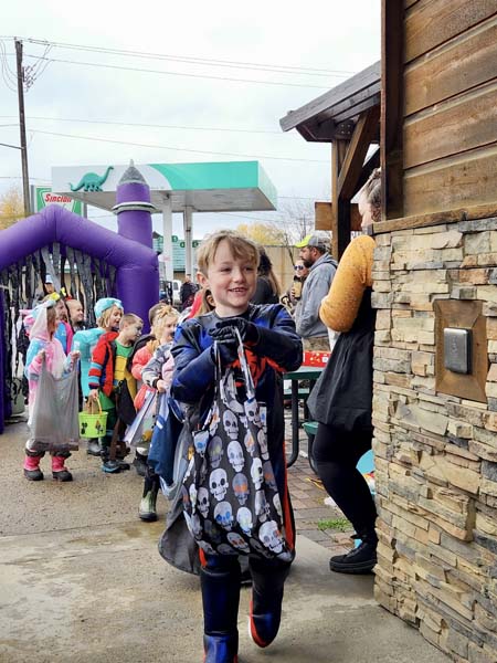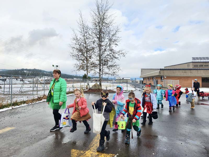 Mrs. Terri Smith’s First grade class leaving the school for the Halloween Trick or Treat Parade. Photo credit: Rachel ReynagaFirst and Second Graders trick or treat between the arch at Brown’s Mountain Market and Idaho First Bank in New Meadows. Photo credit: Rachel Reynaga
