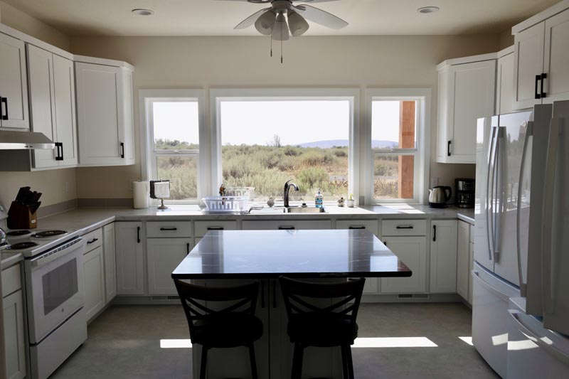 The kitchen where guests can store and prepare their food has two refrigerators, a large window over the sink looking to the west and a beautiful black quartz countertop on the island.
