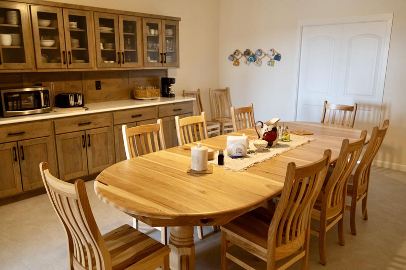 Between these two wings there is a large kitchen, a dining room and a great room. The great room has large windows that let you enjoy the view to the north and east as well as plenty of comfortable furniture for retreatants to enjoy as they pray and spend time here.