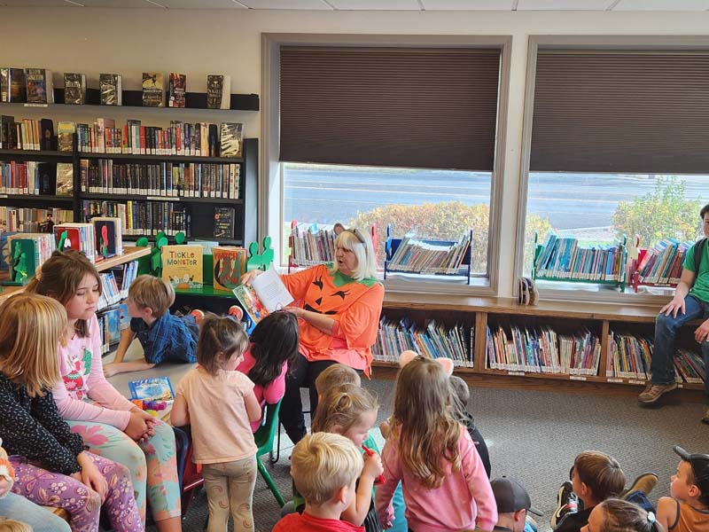 Volunteer Marlene Clark read “It’s Pumpkin Day, Mouse!” and “The Gray Mouse and the Pumpkin Patch House” to 49 attentive children at the Meadows Valley Library on Wednesday, October 9. Clark always dresses the part, and this time was no exception, as she wore a pumpkin costume accented by a mouse ear headband.