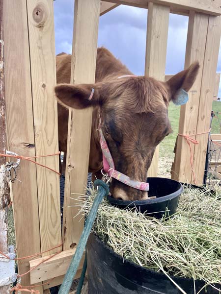 For a while. That flake of hay was good and heavy, though, and it was clumsy to carry everything up the hill. So, change number two. I set out the hay and treats and called the cow. She didn’t come. So I trudged up the hill with her treats and the lead rope and lured –and dragged–her down to her hay. Okay good. And it was. She quickly got the hang of it and came running when I showed up with food. Life was good, milking was fun, and boy, that milk is good!