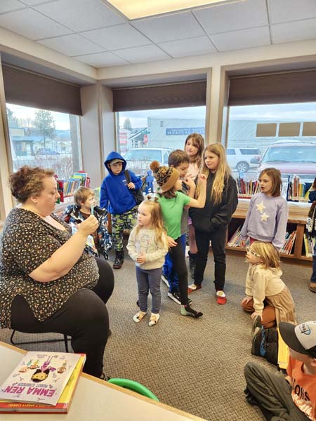 About 25 children listened to librarian Audrey Crogh (left) read robot related stories at the Meadows Valley Library on Wednesday, January 8. After stories, the kids stenciled pictures of robots and put together a sticky dot picture of a robot. Pictures will be on display at the library this month. Crogh read Emma Ren Robot Engineer by Jenny Lu and Pete the Cat: Robo Pete by James Dean. The next story time will be heart themed and is scheduled for Wednesday, February 12 at 4:00 p.m..
