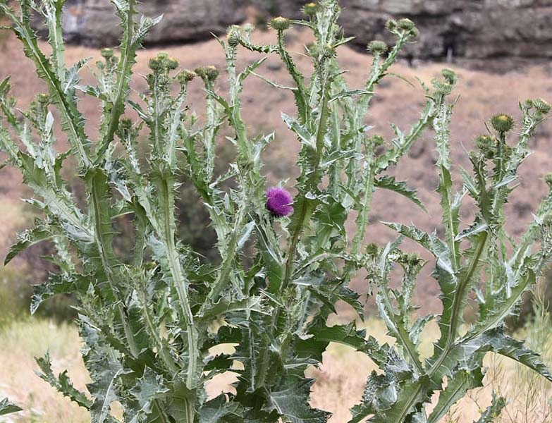Onopordum acanthium, Scotch thistle, is the only member of its family reported in Idaho, but it has been wildly successful in weed terms, being reported in every one of Idaho’s 44 counties. Idaho has plenty of thistles, both invasive and native, but the others belong to either Carduus or Cirsium. Worldwide, Onopordum boasts 46 species. Like many of our invaders, it hails from Eurasia and the Mediterranean.