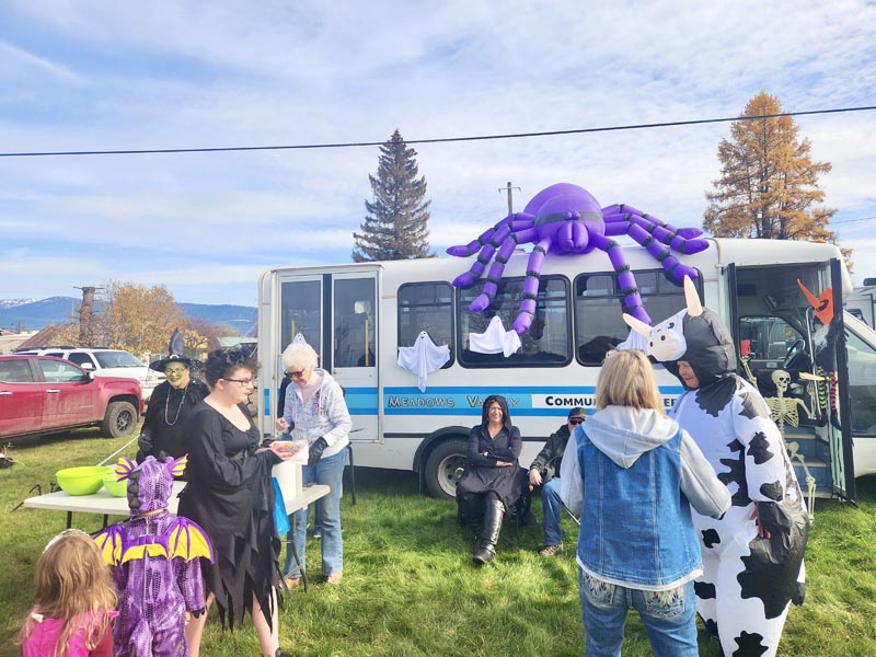 Blow up dinosaurs fought one another and ran from costumed children while trick or treaters went trunk to trunk at the Meadows Valley Trunk or Treat on Friday, October 31. The MV Community Center brought their bus and shared hot dogs and chili (and candy of course!) to all passing by.