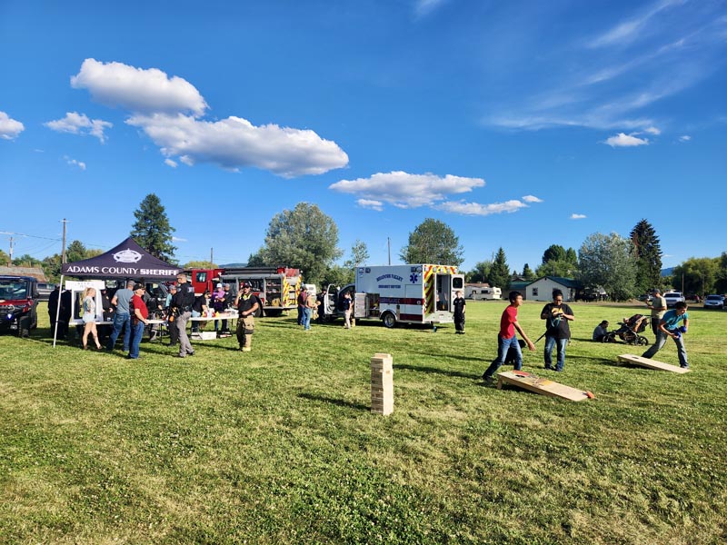 The first responder presence was strong with Adams County Sheriff Ryan Zollman and his team as well as Meadows Valley Fire & EMS. Sheriff’s vehicles and a giant drone were available to peruse as were an MV ambulance and fire truck. Kids enjoyed climbing in and around the vehicles and learning about what is inside. Hot dogs and fixings were available along with conversation and information.