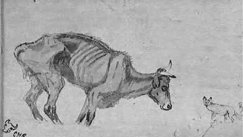 Blizzards and –40°F temperatures across the Great Plains and Montana trapped and froze thousands of cattle. Charlie Russell was working as a cowboy in Montana’s Judith Basin at the time. When his boss asked for a report on how his herd was wintering, Charlie sent a watercolor titled “Waiting for a Chinook,” showing a starving cow stocked by wolves. The image became well-known and marked Russell’s transition from cowboy to “Cowboy Artist.”