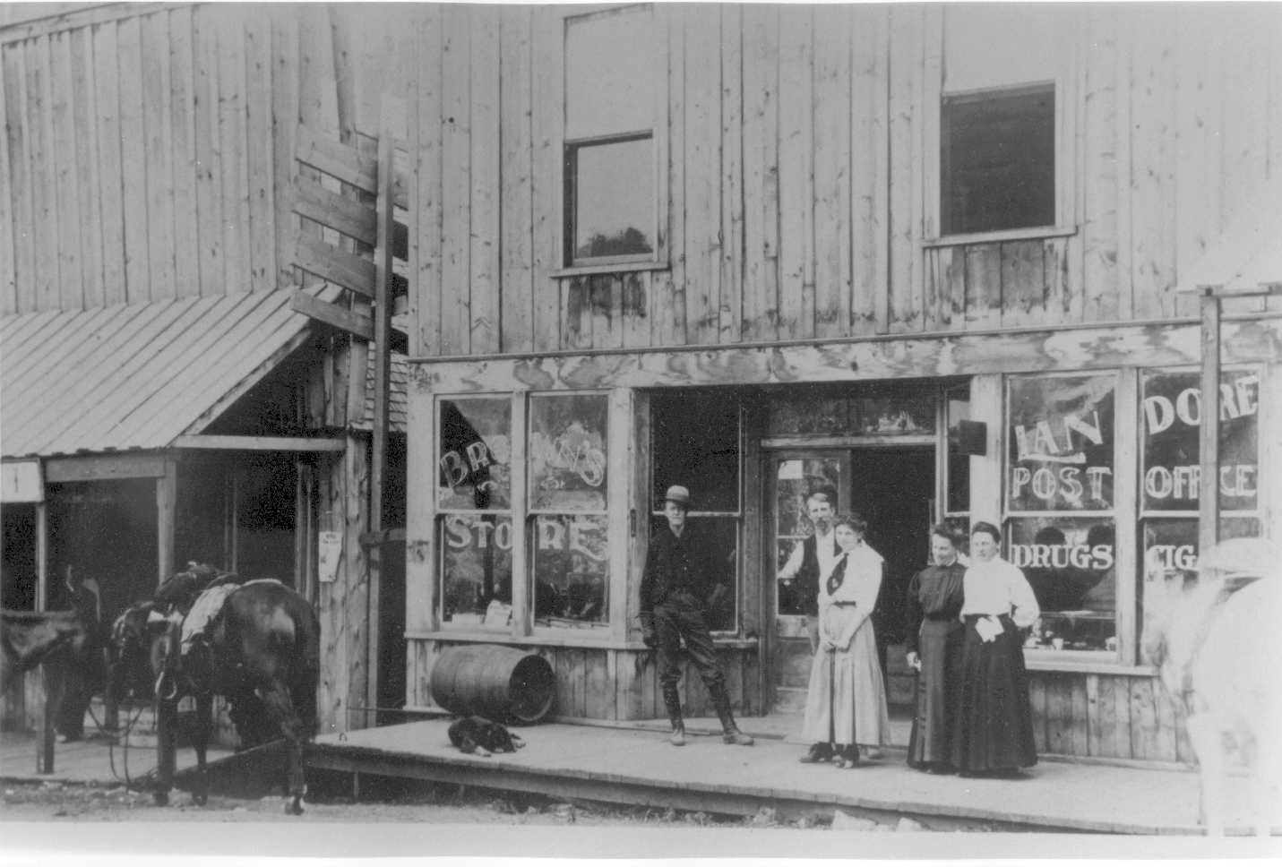 Browns store at Landore, 1908. The people are, in no particular order: William W. Irwin, Dr. Wm Brown, Winifred Brown, Mrs. Edwards, and Mrs. Emma Brown.