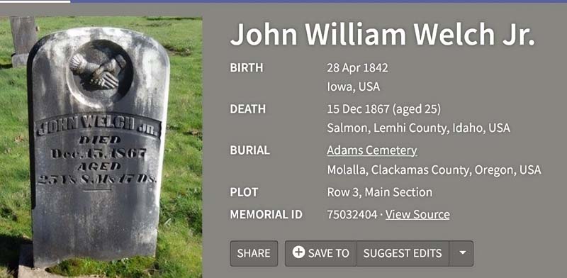 Packer John Welch was 25 years old when he was murdered. His brother, William, retrieved the body and took it back to Malalla, Oregon (southeast of Portland) for burial.