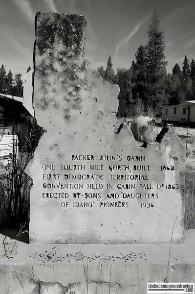 In 1936 the concrete, Idaho-shaped monument to the cabin was erected on Highway 55 by the Sons and Daughters of Idaho Pioneers. Also that year, American Legion Post 111 and the Ladies Club of Meadows Valley gave a bronze plaque to be placed on the cabin. It isn’t known what happened to that plaque. It is apparently in private hands, but it doesn’t seem to belong to anyone local.