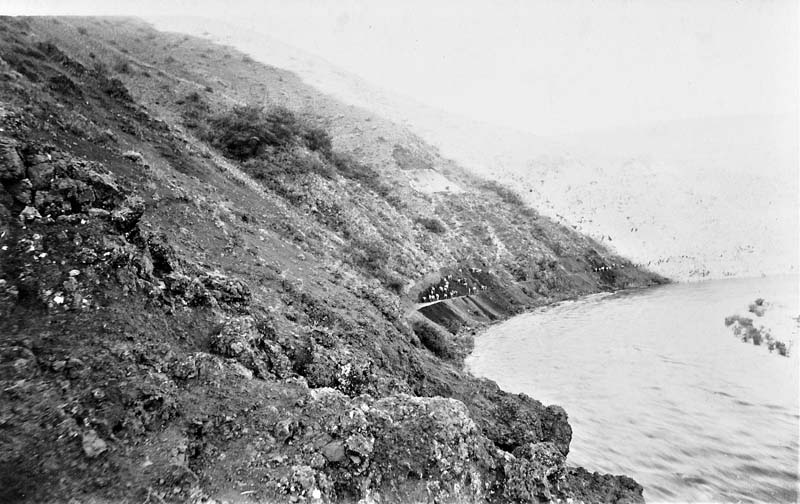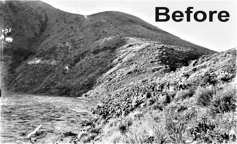 The P&IN put 800 Japanese workers to attack this canyon with picks and shovels, as it was too steep to use horse-drawn equipment until a crude path had been hacked from the hillsides. It would take months to create a railroad grade through this canyon. Meanwhile 2,000 more workers were scattered in camps along other parts of the planned route. Huge quantities of hay and grain were needed to feed at least 450 teams of a minimum of 900 horses.